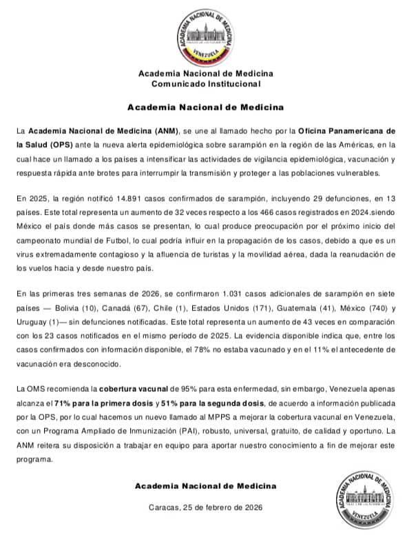 Academia Nacional de Medicina. Comunicado ante la nueva alerta epidemiológica sobre Sarampión en las Américas / De Interés, Declaraciones / Por Academia Nacional de Medicina Compartir PDF