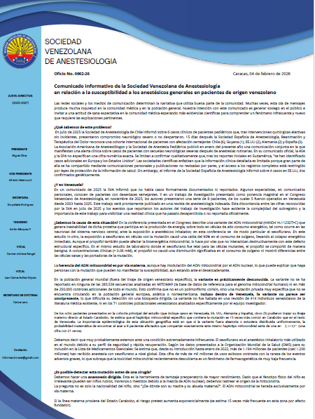 Comunicado informativo de la Sociedad Venezolana de Anestesiología en relación a la susceptibilidad a los anestésicos generales en pacientes de origen venezolano / Academias y Sociedades, De Interés, Declaraciones / Por Academia Nacional de Medicina Compartir PDF