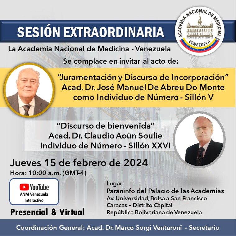 La Junta Directiva de la Academia Nacional de Medicina tiene el agrado de invitar asus miembros Individuos de Número, Miembros Correspondientes Nacionales y Extranjeros, Invitados de Cortesía, profesionales del área de la salud, estudiantes y público en general, a una sesión Extraordinaria que se efectuará el día jueves 15 de febrero de 2024, a las 10:00 AM, en modalidad presencial en el Salón de reuniones de la Academia y virtual por plataforma Zoom, de acuerdo al siguiente programa: