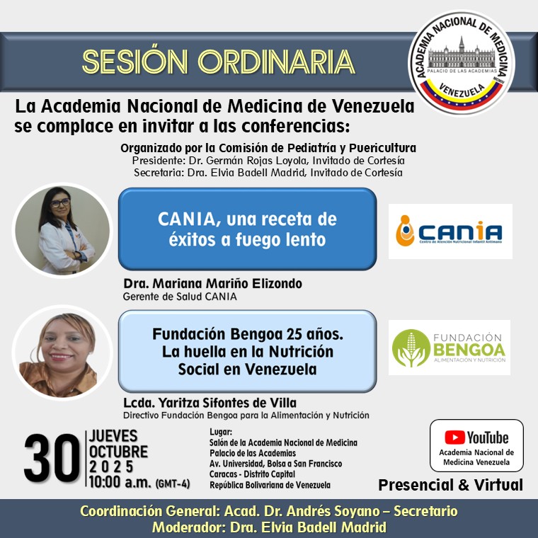 La Junta Directiva de la Academia Nacional de Medicina tiene el agrado de invitar a los Individuos de Número, Miembros Correspondientes Nacionales y Extranjeros, Invitados de Cortesía, profesionales del área de la salud, estudiantes y público en general a la Sesión Ordinaria que se realizará el día jueves, 30 de octubre de 2025, a las 10:00 am, en las modalidades presencial en la Sala de Sesiones de la Academia Nacional de Medicina (Palacio de las Academias) y virtual por las plataformas Zoom y YouTube, de acuerdo al siguiente orden del día:
